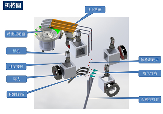 在藥粒檢測過程中,需進(jìn)行藥粒上白點(diǎn)、藥粒圓不圓、藥粒的粘連、藥粒的色澤正確等功能,檢測完成后輸出OK、NG信號(hào),在排廢位進(jìn)行剔除動(dòng)作。系統(tǒng)采用進(jìn)口工業(yè)相機(jī)快速獲取產(chǎn)品圖像,通過圖像識(shí)別、分析和計(jì)算,輸出檢測信號(hào)。 二、【藥粒檢測系統(tǒng)結(jié)構(gòu)圖】