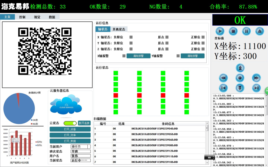 云平臺可監(jiān)控記錄設(shè)備的運(yùn)動參數(shù)及視覺的檢測結(jié)果,通過互聯(lián)網(wǎng)隨時(shí)監(jiān)控生產(chǎn)數(shù)據(jù)及設(shè)備運(yùn)行情況。