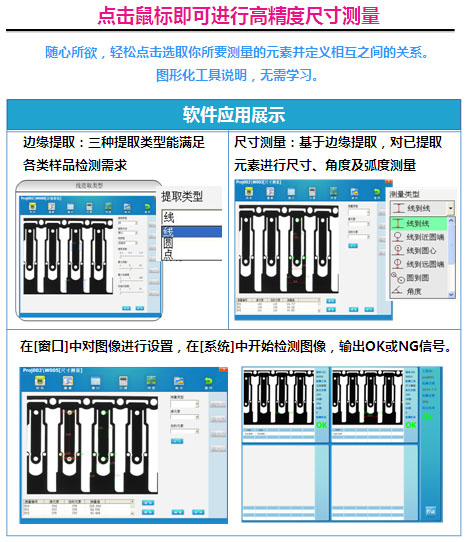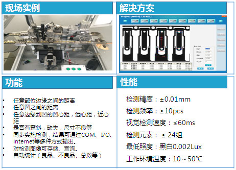 智能沖壓件檢測儀功能描述 1.任意部位邊緣之間的距離 2.任意圓之間的距離 3.任意邊緣到圓的圓心距,遠心距,近心距 4.是否有歪斜,缺失,尺寸不良等 5.同步實施檢測,結果可通過COM、I/O、internet等多種方式輸出。 6.對檢測圖像可存儲、查詢。 7.自動統計(良品、不良品、總數等)